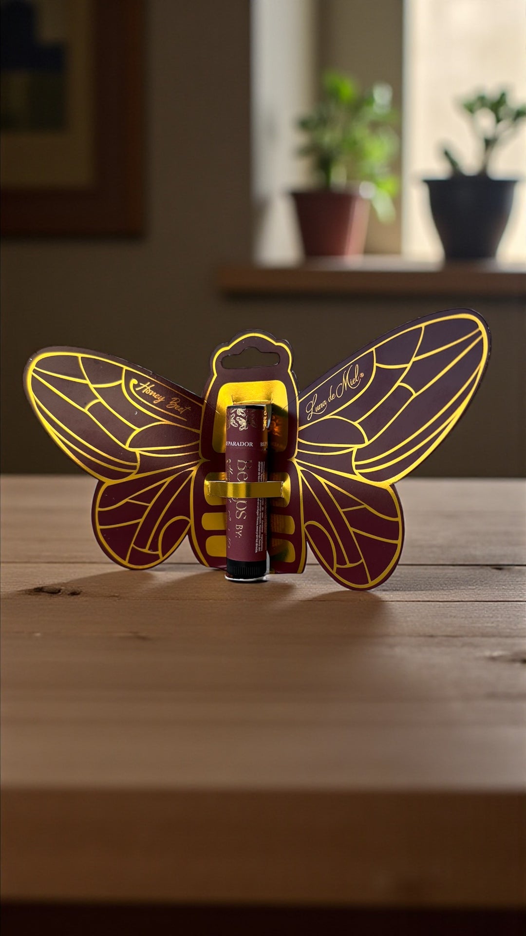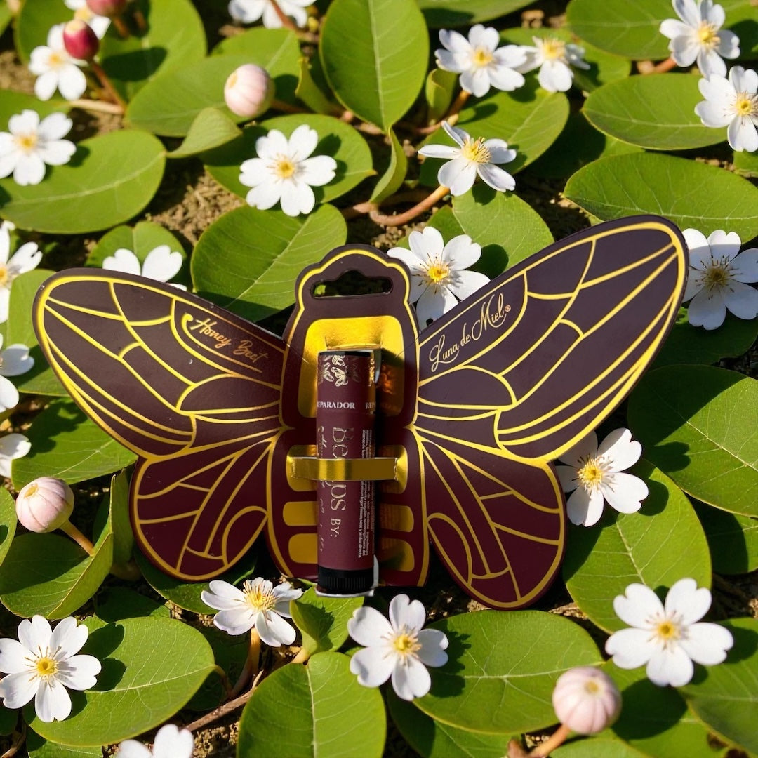 Ingredientes activos: Cera de abejas pura, miel, propóleo, jalea real, aceites de aguacate y almendras, aceites esenciales (menta, lavanda, tea tree, eucalipto), vitamina E y pigmento natural rojo.