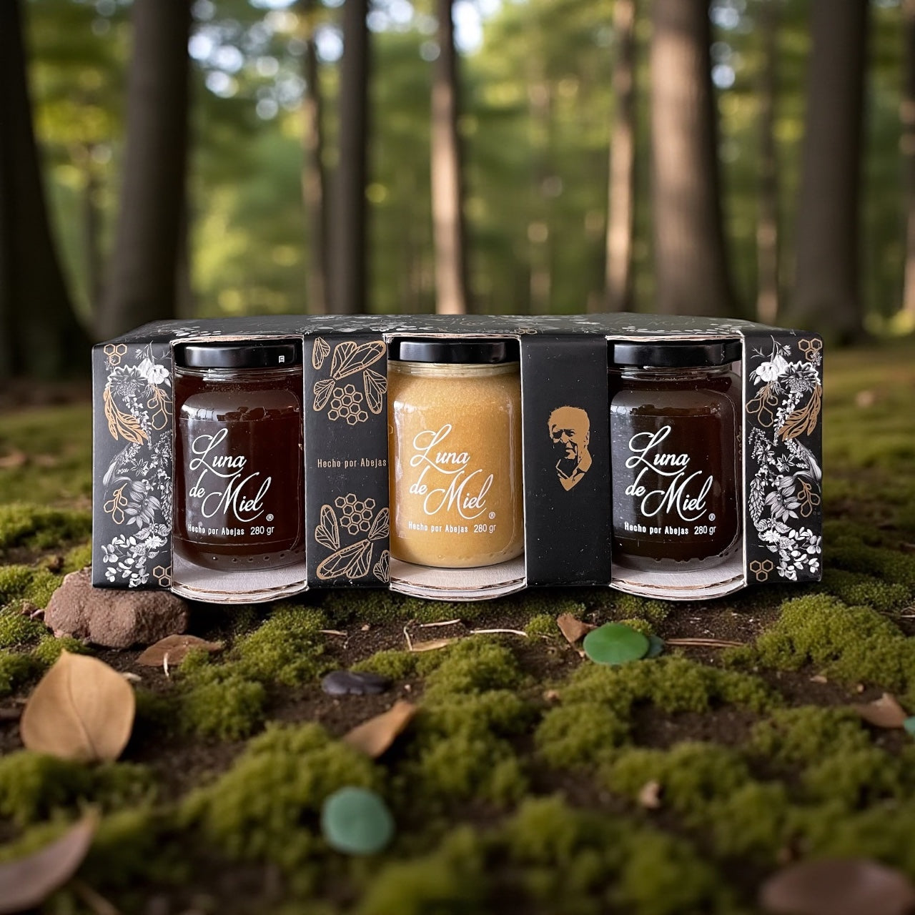 Tres mieles cremadas de 280g cada una. 100% orgánico en elegante caja de regalo.